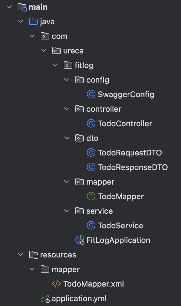 - 각 도메인 폴더 내부에는 해당 기능에 필요한 controller, service, mapper, dto, entity 등이 함께 포함된다.