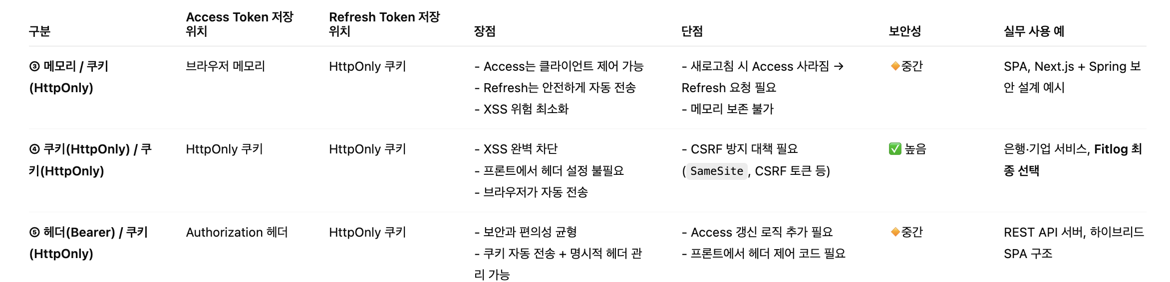 ➡️ 최종적으로 Access Token을 JS 메모리에 저장하고, Refresh Token을 HttpOnly Cookies에 저장하여 관리하는 방법으로 구현하였다.