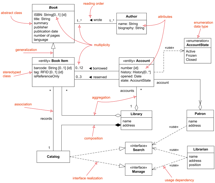 - 클래스 간 관계(연관, 상속, 집합, 합성 등) 표현