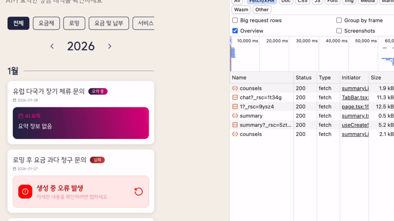 상담 내역에서 '요약 시작' 버튼을 누르면, 요약 리스트로 redirect 되면서 요약 상태가 PENDING에서 COMPLETED 혹은 FAILED가 되면, 요약 카드가 실시간으로 업데이트되도록 구현하였다.